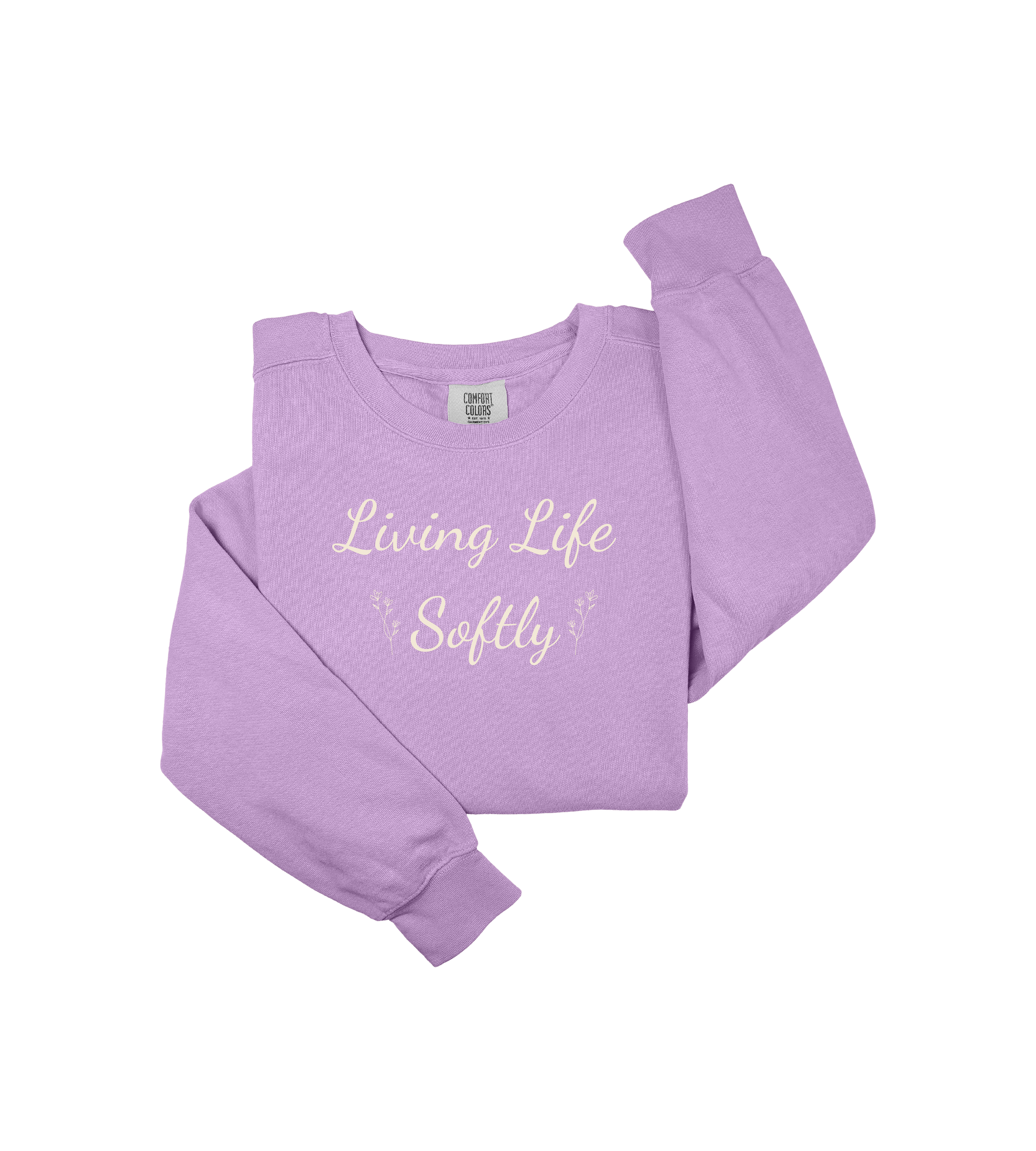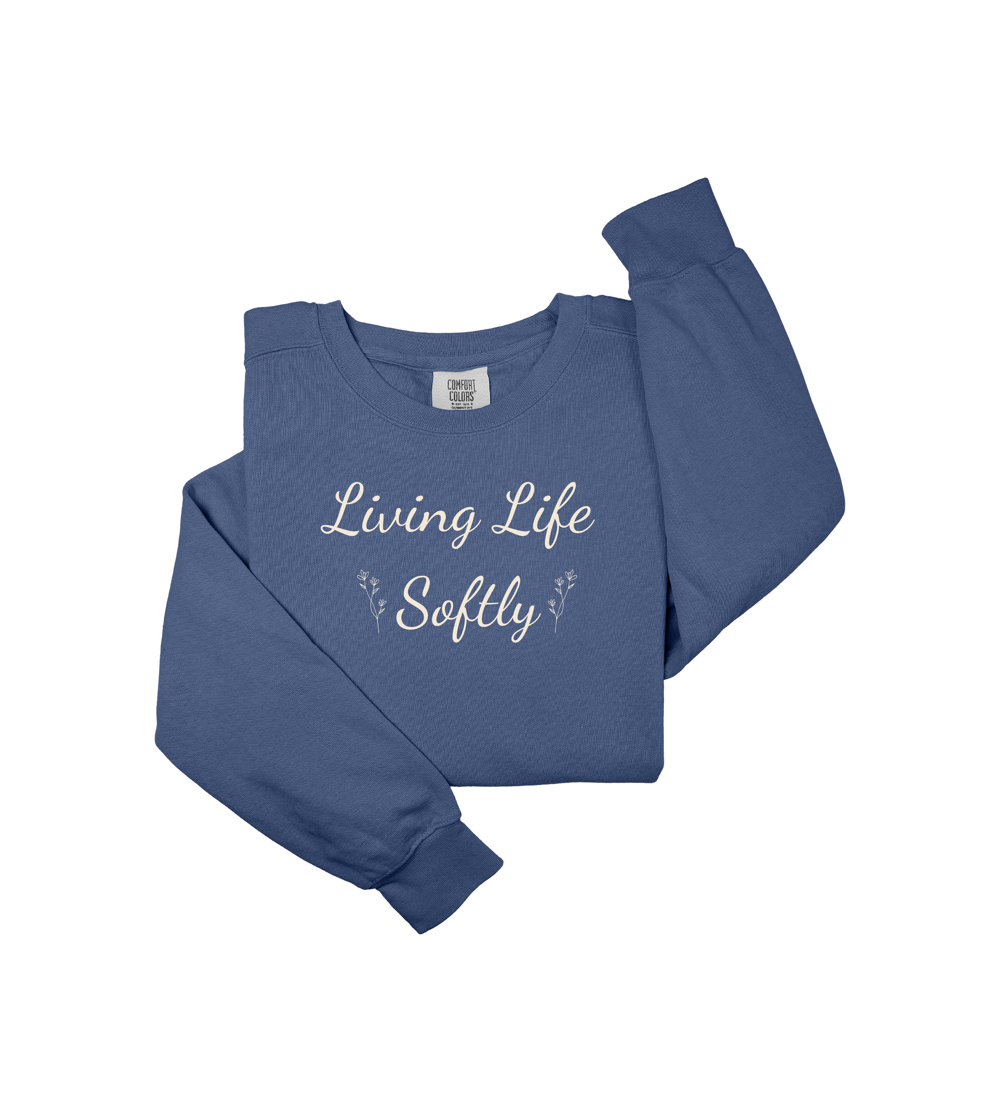 This relaxed, garment-dyed sweatshirt whispers calm. Soft ring-spun cotton with a bit of stretch drapes easily over layered tees and favorite jeans, while the embroidered “Living Life Softly” script and tiny floral accents bring a quiet, intentional touch. It’s the kind of sweatshirt you reach for on slow mornings, to carry to a friend’s low-key brunch, or to wear during evening walks when you want warmth without stiffness. Subtle color, thoughtful details like the half-moon neck patch and ribbed hems, and OEKO-TEX low-impact dyes make it feel lived-in and responsibly made — a gentle companion for days when comfort and a calm aesthetic matter most.